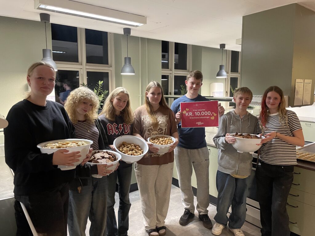 Eleverne har været i fuld gang med et velgørenhedsprojekt for Danmarks Indsamling der afholdes i januar. De har bagt og solgt småkager til lokale virksomheder, og det gav hele 5.000 kr. i kassen. Sammen med 5.000 kr. fra julemarkedet i starten af december kan vi nu sende 10.000 kr. afsted til det gode formål.